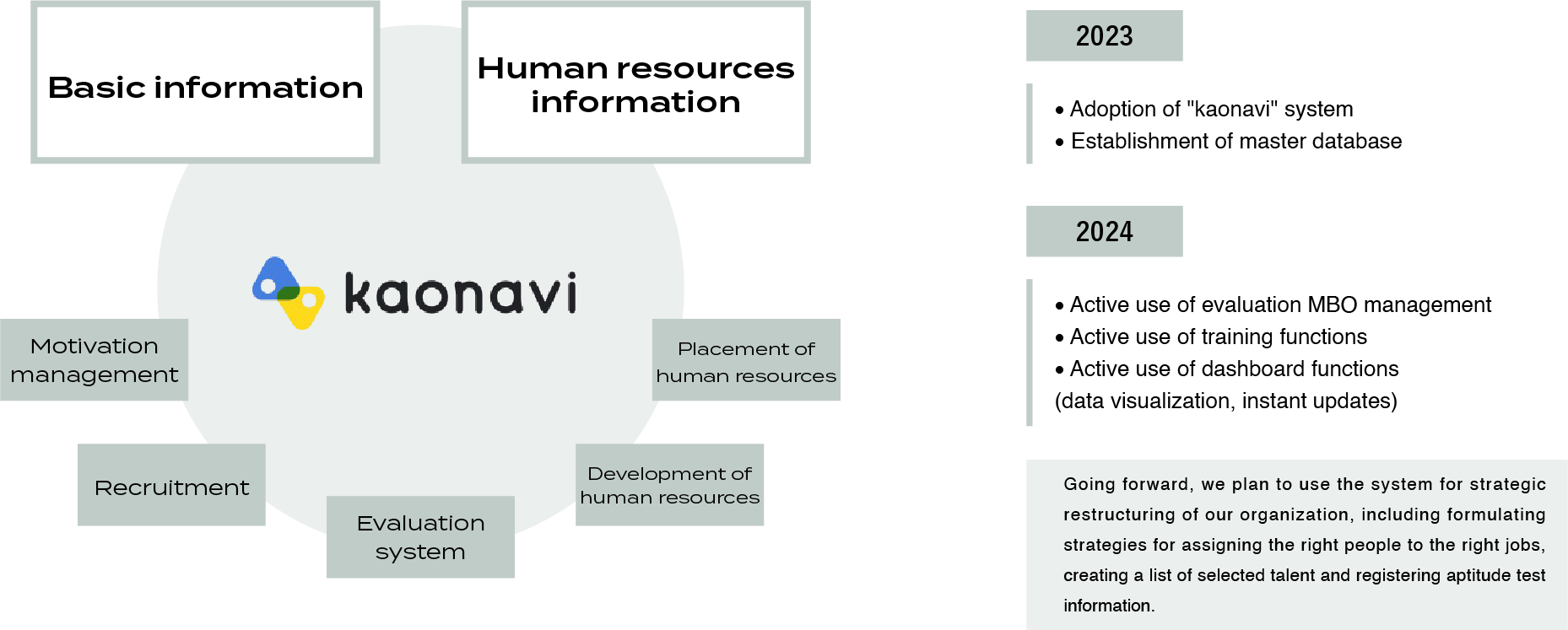 Since our greatest asset is our "human resources," we have adopted the Kaonavi talent management system, which treats individual employee capabilities and personalities as important management capital and utilizes them in hiring, placement and training to maximize employee and organizational performance. Centrally managing employee information (including basic employee information, affiliation, skills and qualifications, transfer history, training attendance, and health status) allows us to revitalize our organization and also serve as a driving force for continuous growth.