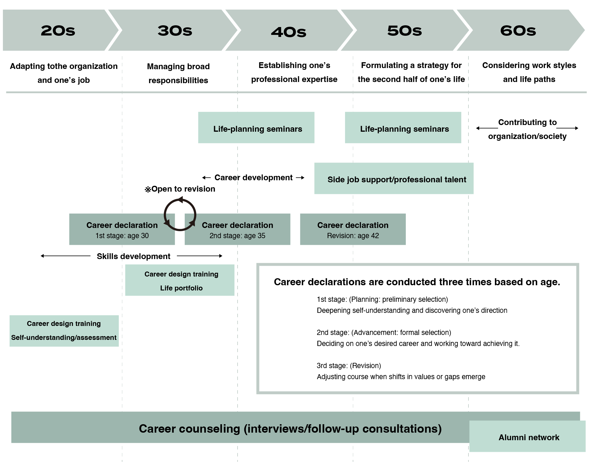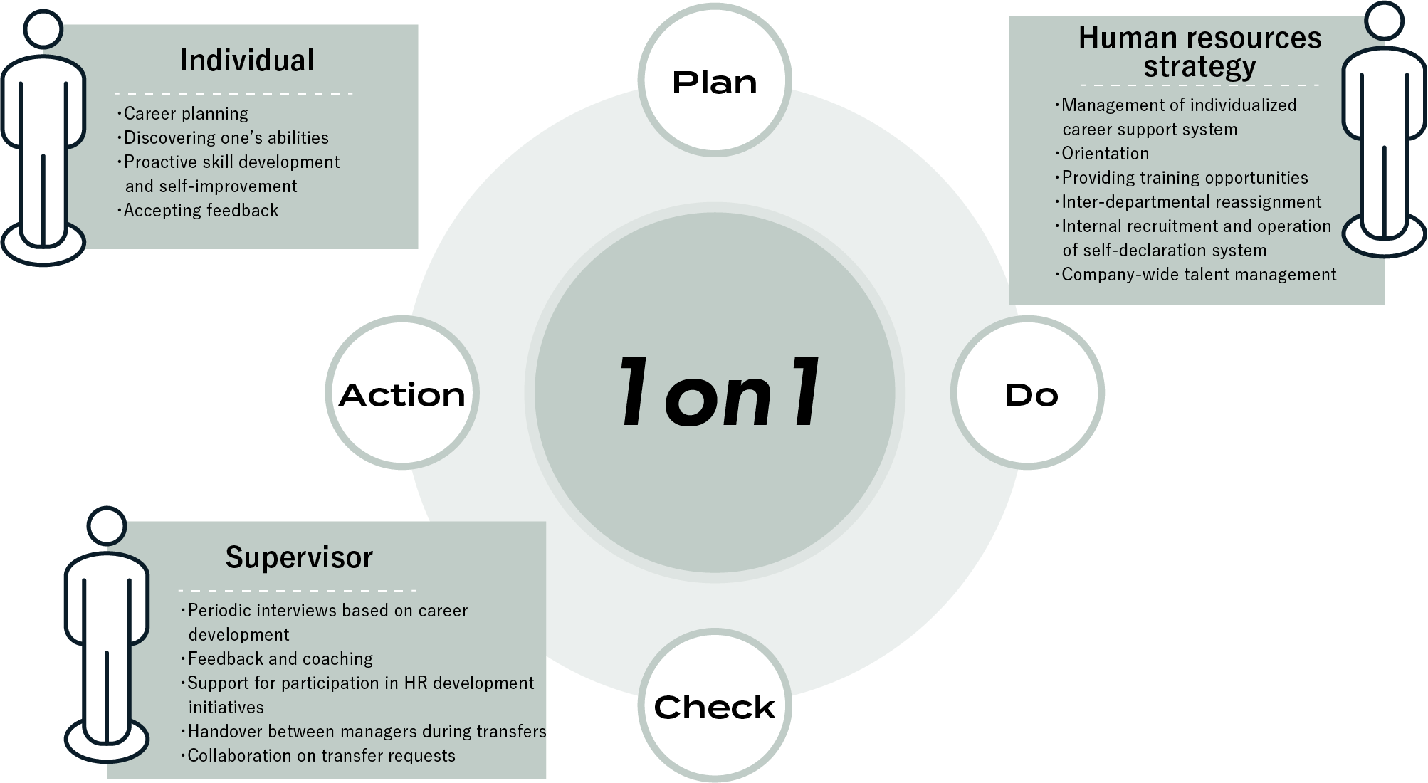 Choosing one's career is a crucial step in envisioning your future, and the primary agent in this process is, without question, yourself. This process requires constantly deepening your self-understanding and maintaining awareness, setting goals and taking action to turn your chosen career path into reality. At the same time, managers must understand that the growth of each individual employee contributes to organizational development. They are therefore expected to support their subordinates' career development with a holistic perspective, aiming for the best outcome for the entire team. Through daily checks and one-on-one meetings, they are asked to promote self-understanding and provide guidance for their subordinates' career choices and their fulfillment.
