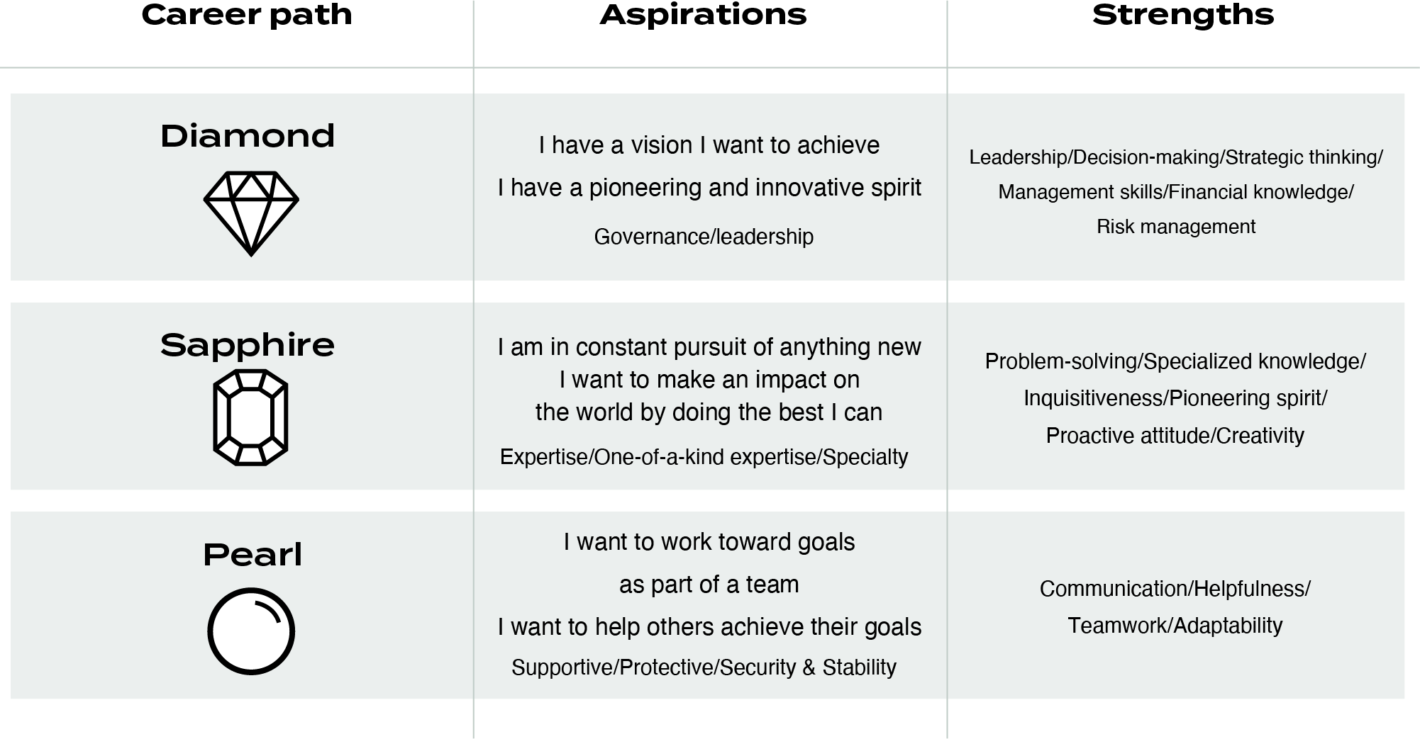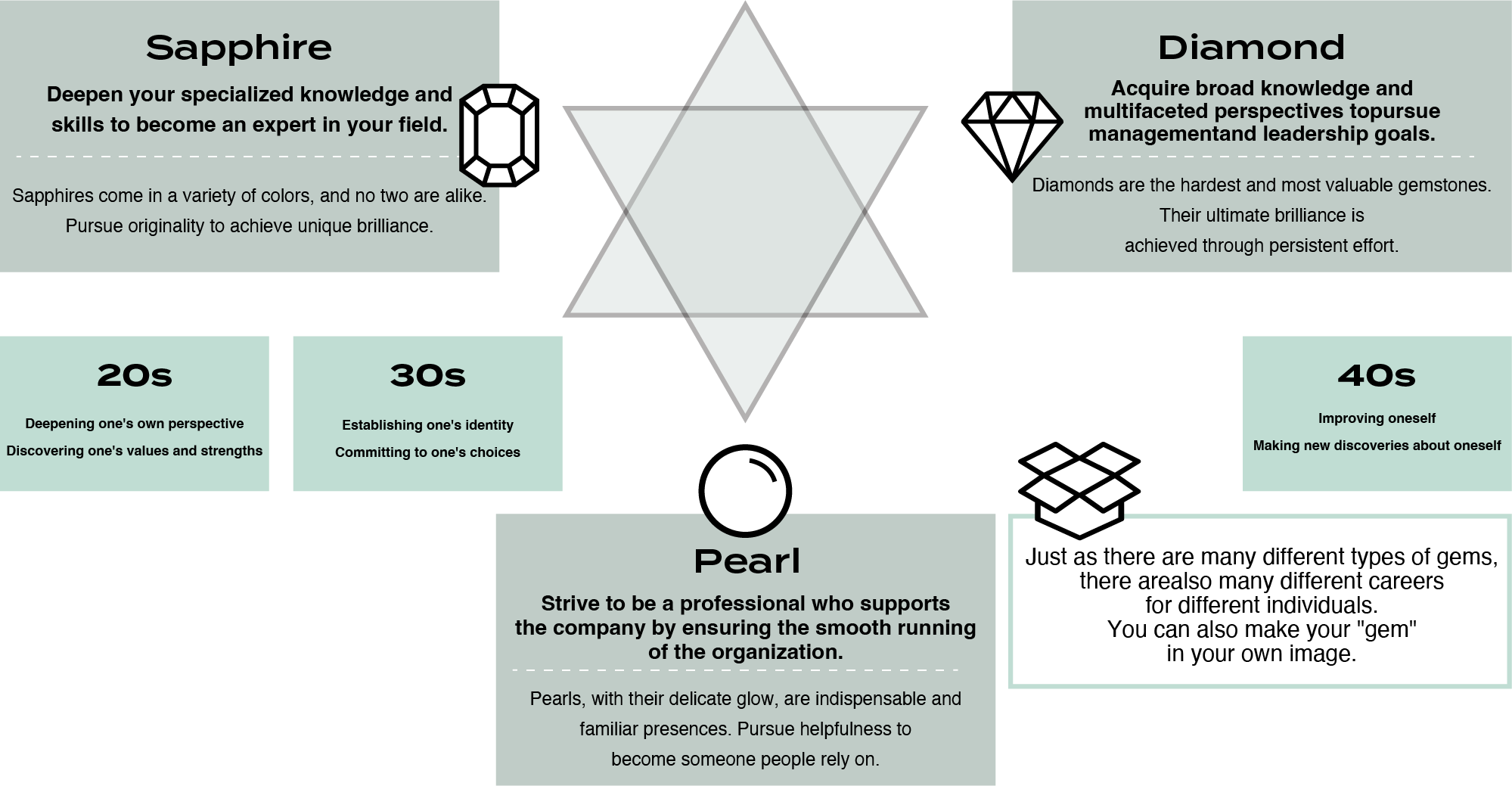 We liken the career development process to the process of unearthing rough stones and refining them into gemstones and have coined the expression "gem-like career." We categorize career paths into three types: Diamond, Sapphire and Pearl. By choosing the one that best suits their aspirations and sharing it with the company, employees will receive support tailored to their choice.