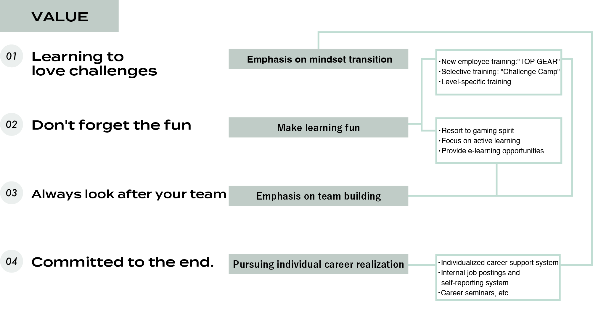 Within the KANAMEL Group, training programs and development initiatives are designed with our four core VALUES in mind to foster an approach that is uniquely ours: "fun to learn" and "emotionally stirring."